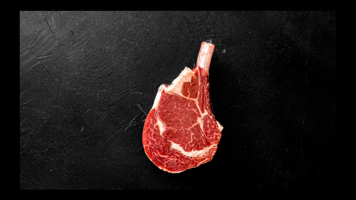 The steak is cut from the fore rib and has the entire rib bone intact. Full of flavour due to intramuscular marbling but not overly tough.