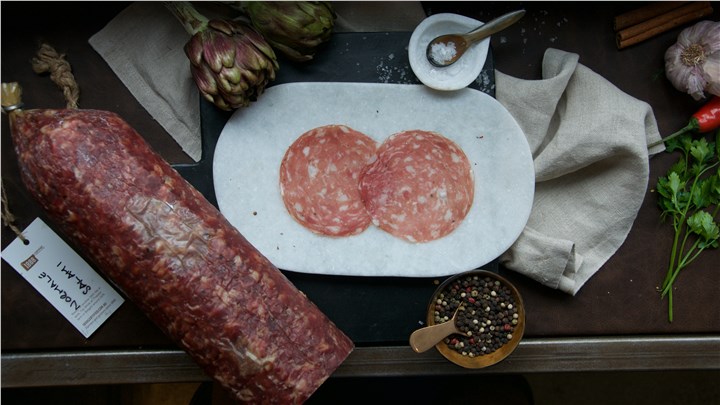 The feature that makes the product special is the whole pork tenderloin. The tenderloin is ground and mixed with bacon (~30% bacon), pepper & Prosecco. It has a very intense aroma while the taste is soft, full and wonderful.