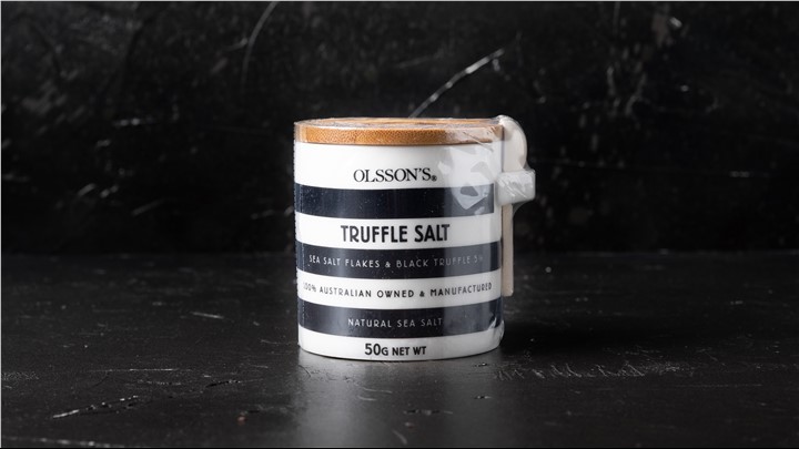 The seductress of all seasonings, Olsson’s Truffle Salt is delicate, mysterious and highly perfumed. High quality Australian sea salt flakes are combined with finely shaved fresh (not freeze-dried) Black Perigord Truffles, Australian grown. The earthy character of the truffle infuses every single flake to create a subtler flavour carrier than truffle oil. Olsson’s Truffle Salt provides a more affordable way of utilising and prolonging the intoxicating flavours of Black Perigord Truffles.