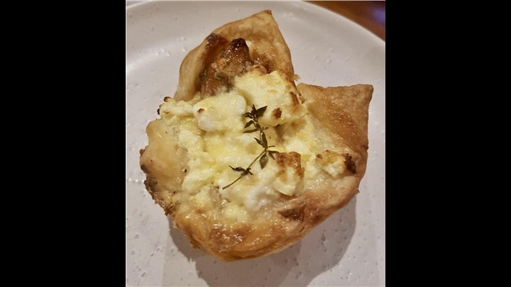 This tart is filled with cloves of garlic, caramelized in balsamic vinegar, and two kinds of goat cheese, rosemary, thyme & creme fraiche. It's hard to perfect but worth all thye effort.